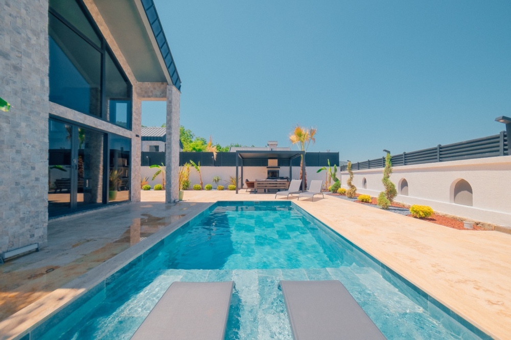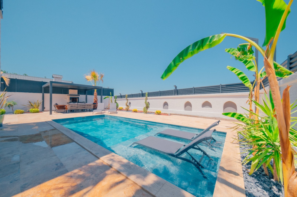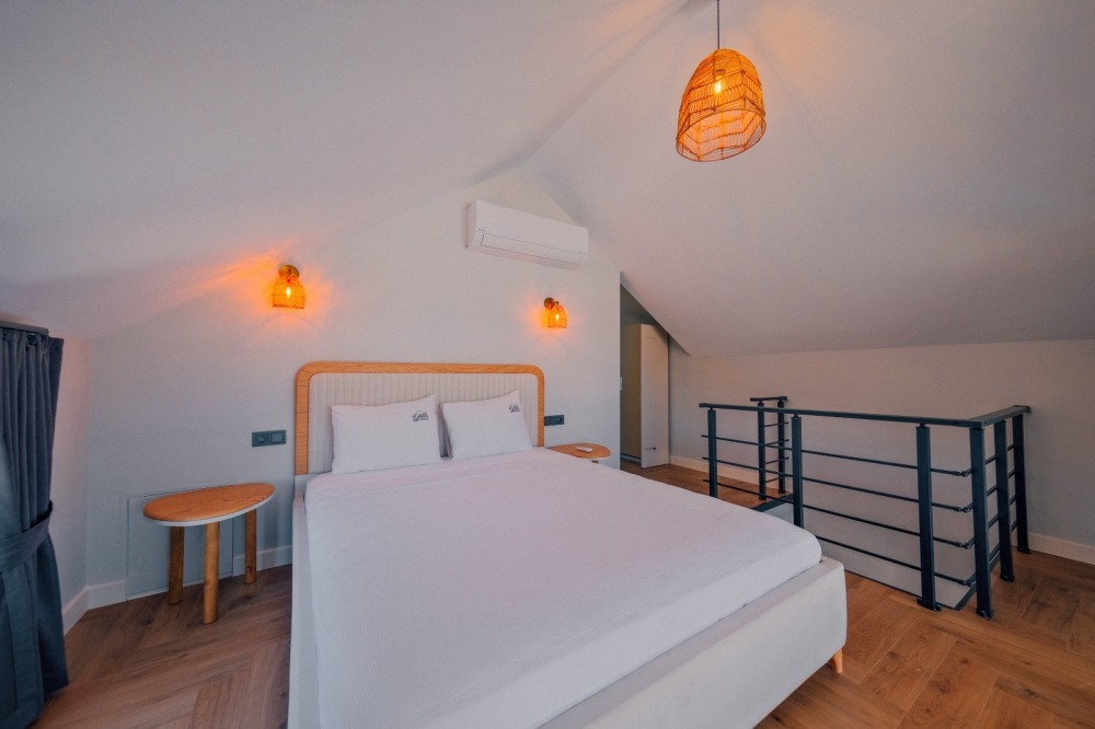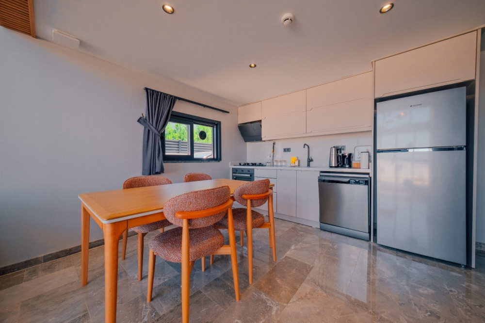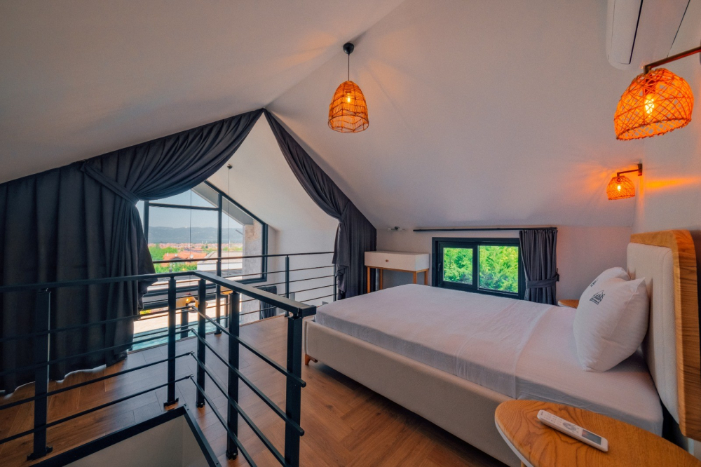 Bali Bungalov Suit Evimiz, 9 kişilik kapasiteye sahip olup 4 yatak odalıdır. Her yatak odası ebeveyn banyosuna sahiptir.